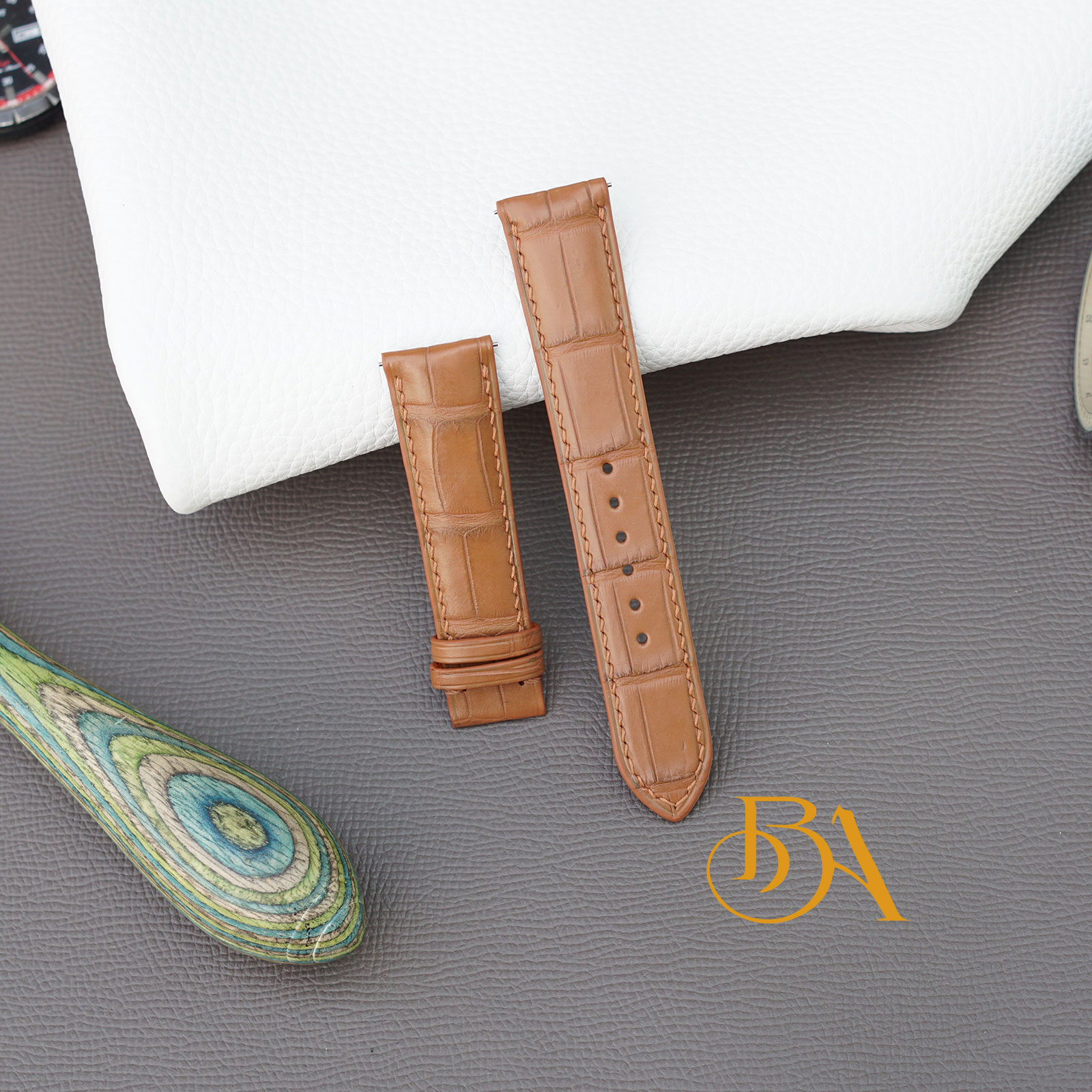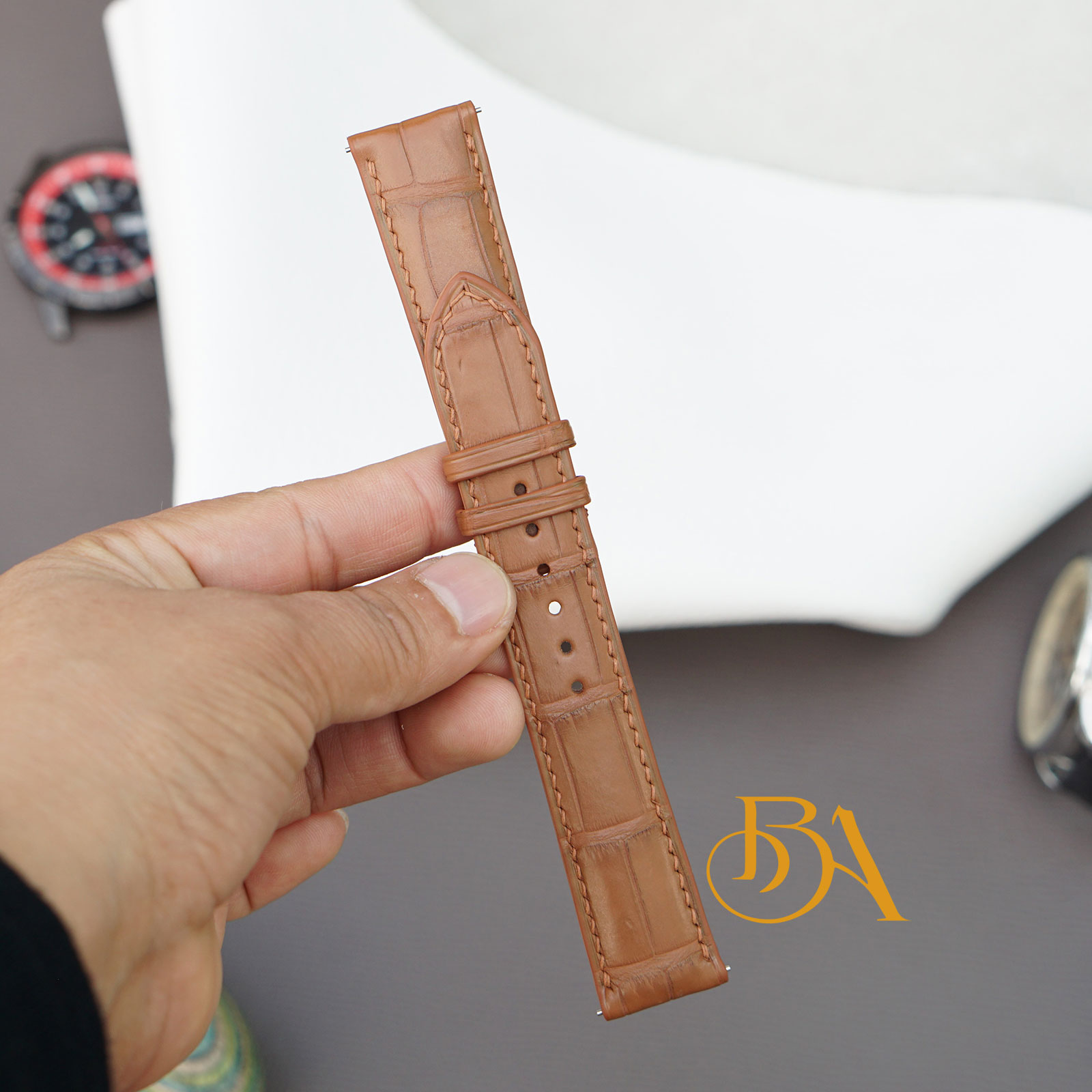 – Mặt trên làm từ da cá sấu Alligator nhập Pháp, một trong những loại da nhập khẩu đẹp độc đáo, được các hãng đồng hồ lớn tin dùng. Mặt dưới da Zermatt nhập khẩu Pháp, loại da lót Zermatt này rất mềm mại, mịn màng và có khả năng chống thấm mồ hôi tương đối tốt. Cổ tay của quý khách thường xuyên ra mồ hôi có thể yên tâm là dây đeo vẫn rất bền bỉ theo thời gian