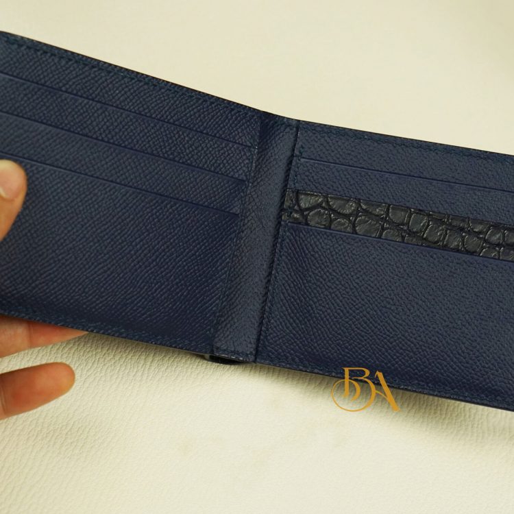 Ví nam da Epsom Handmade, ví da bê phối da cá sấu màu xanh navy CWL141